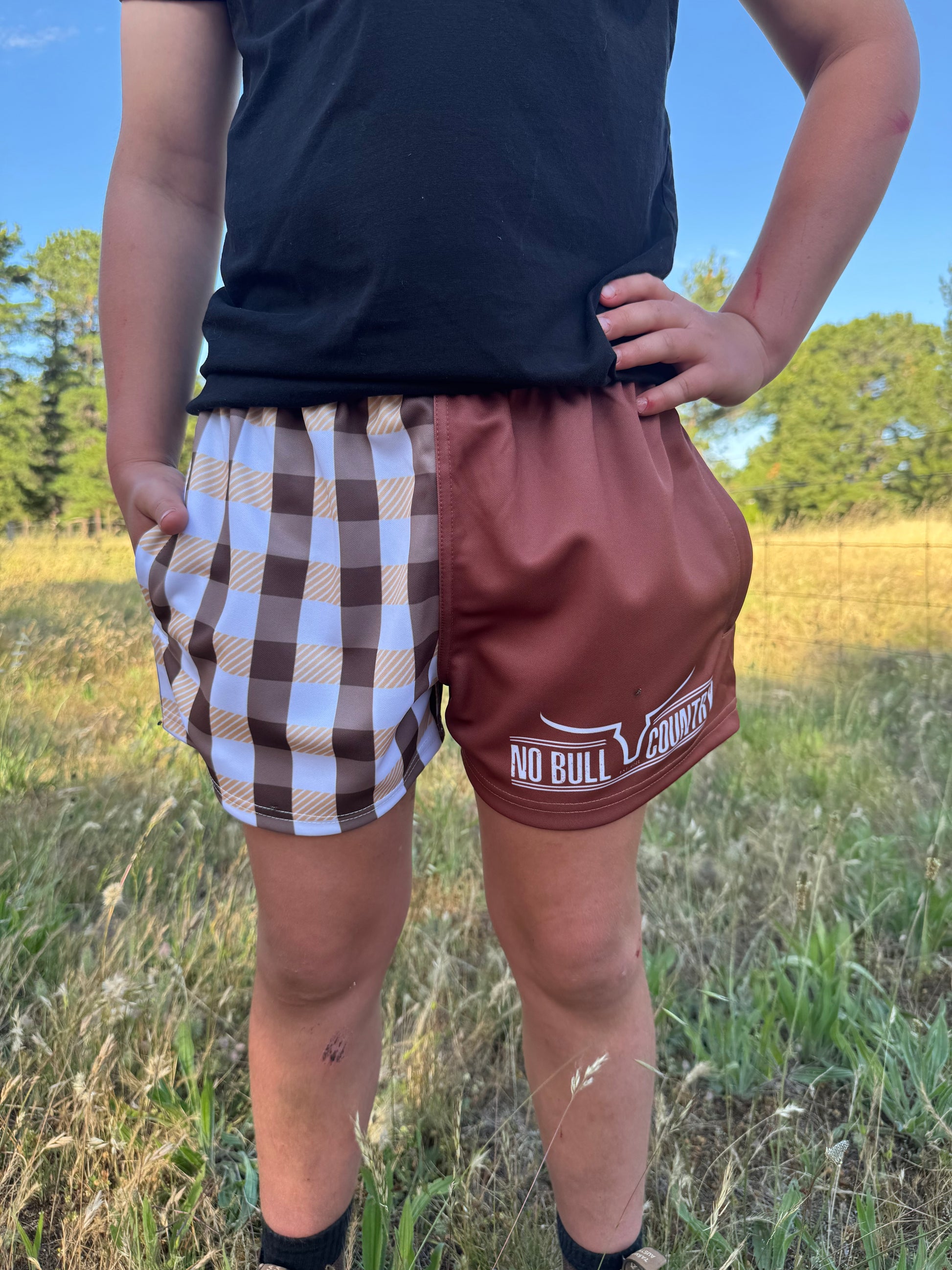 Make a statement with our Brown/Checked No Bull Country Footy Shorts the perfect blend of bold style, comfort, and durability. This design combines a sleek Gingham panel with a classic print, giving you a fresh, standout look whether you’re training, adventuring, or just hanging out.